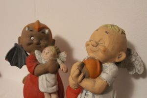 Aber ich weiß auch noch, wie meine Mama dem damaligen Freund meiner Lieblingsschwester den Baum zu Händen gibt, dieser ihn in den Kofferraum seines heiß geliebten historischen Capris steckt, er den Kofferraumdeckel zuknallt und die Baumspitze am seidenen Faden traurig herunterhängt. Zu dieser Zeit war Naturschmuck angesagt, also nichts da mit festlicher Schmuckspitze. Obwohl er, zu Hause angekommen, die Tannenbaumspitze mit Sekundenkleber wieder an der Tanne befestigte, war damals, so glaube ich, schon klar, das er kein Schwiegersohn wird. Wegen dieses Spitzenunfalls heißt es jedes Jahr auf ’s Neue: pass auf die Baumspitze auf. Einen klitzekleinen Augenblick habe ich in dem Moment das Gefühl, meine kleine knubbelige Mama steht neben mir und schmunzelt.