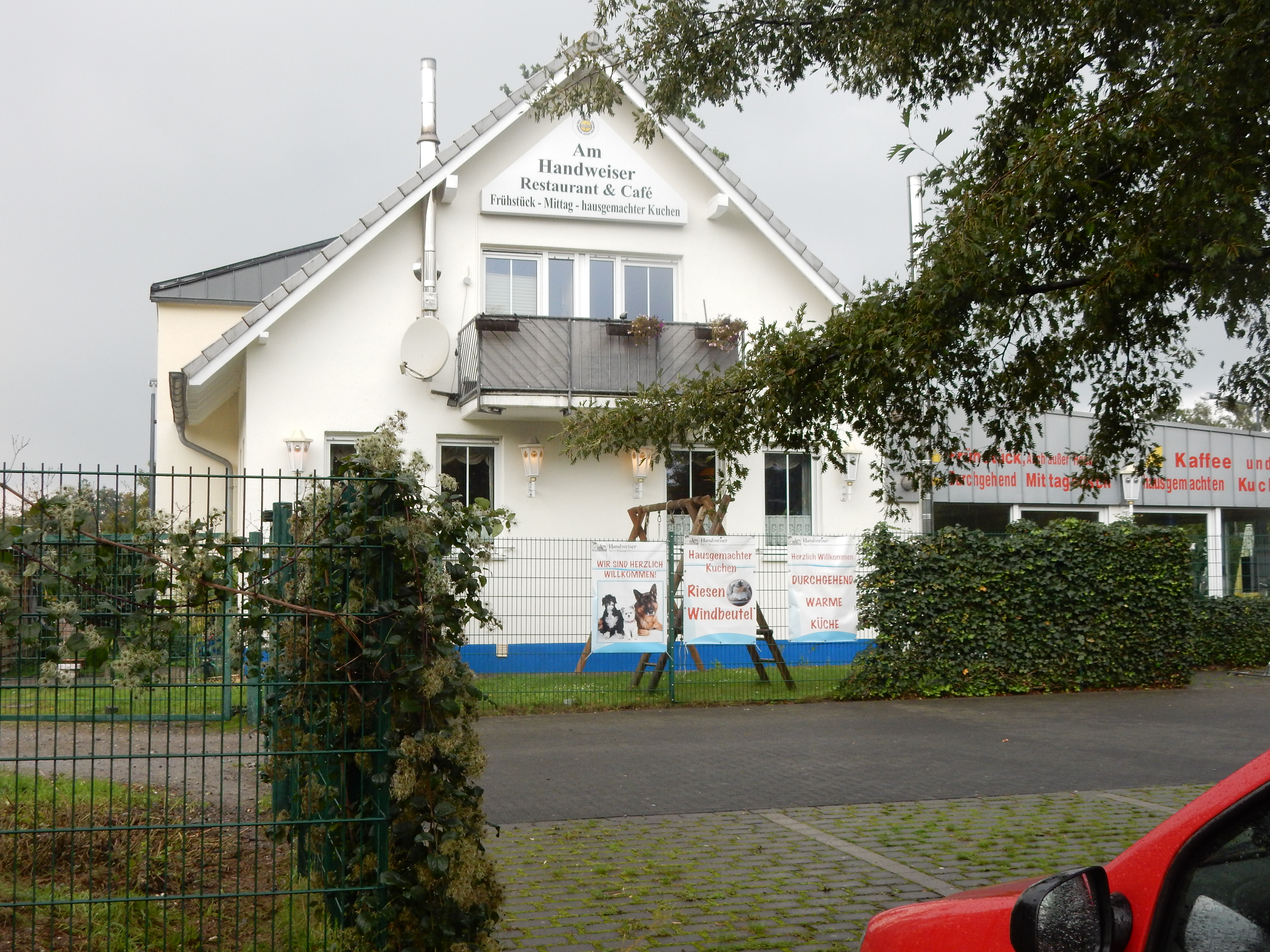Eigentlich waren wir so nass geworden, dass wir gar nicht mehr in das Restaurant „Am Handweiser“ einkehren wollte. Zum Glück haben wir uns anders entschieden. Die Besitzerin empfing uns mit Handtüchern für Mensch und Hunde und Ablagedecken für Zina und Feli. Dem Schild, Hunde sind herzlich willkommen, folgten Taten. Das fanden wir mega toll.