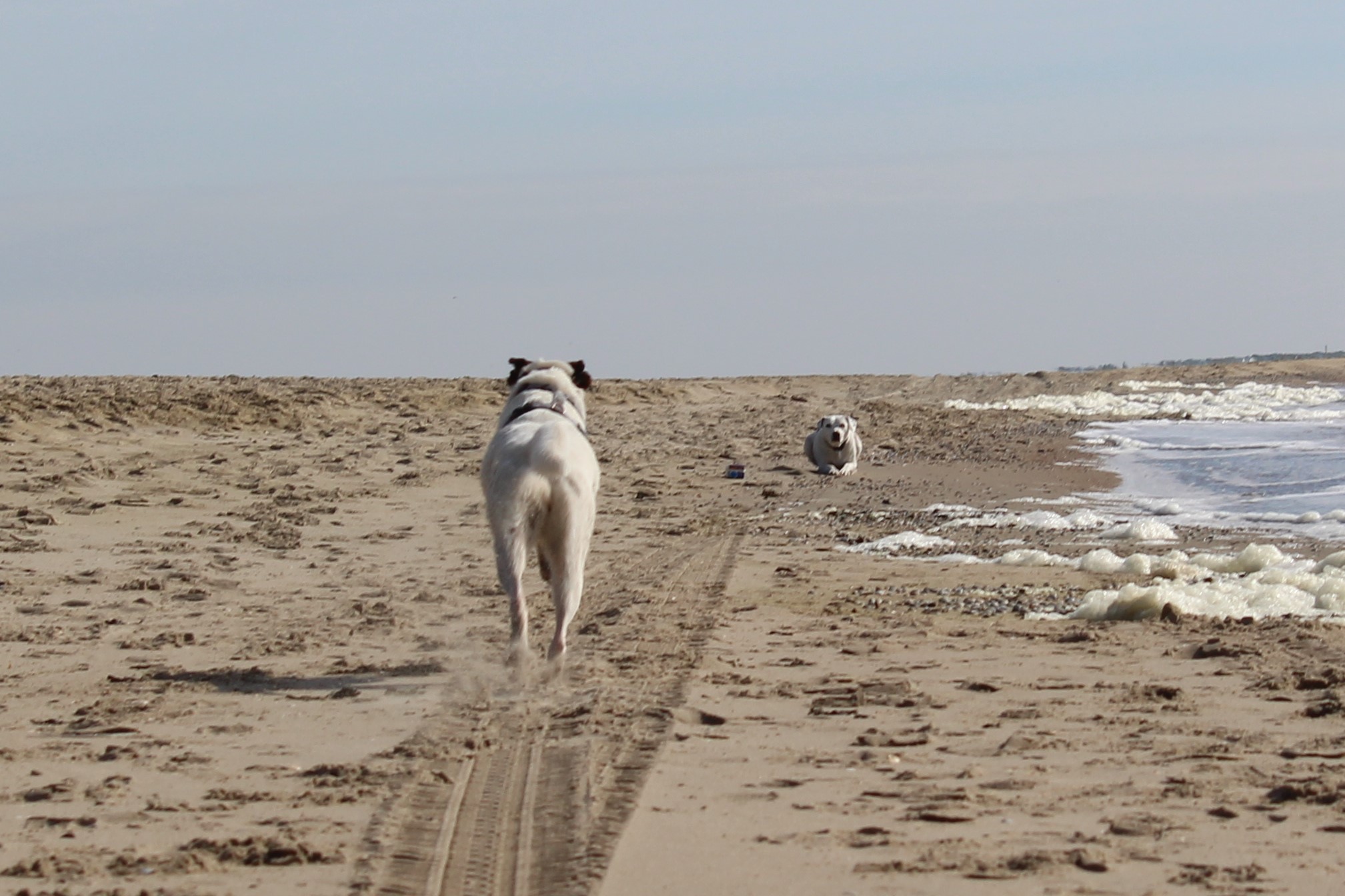 An der Fähre nach Texel drücken wir das erste mal die Nasen an die Scheibe nach der Devise, sind wir bald da? Ich muss euch sagen, jetzt halte ich es kaum noch aus. Ich rieche es! Ich schmecke es! Wir sind zur größten Sandkiste der Hundewelt gefahren. Ich bin so aufgeregt! Frauchen hängt hinten an meiner Leine, wenn wir am Meer sind. Wie in Zeitlupe greifen meine Pfoten in den Sand! Slapstick, sagt Herrchen! Feli will ins Wasser, ich will nur Sand! Ja, auch Hundegeschmäcker sind verschieden!
