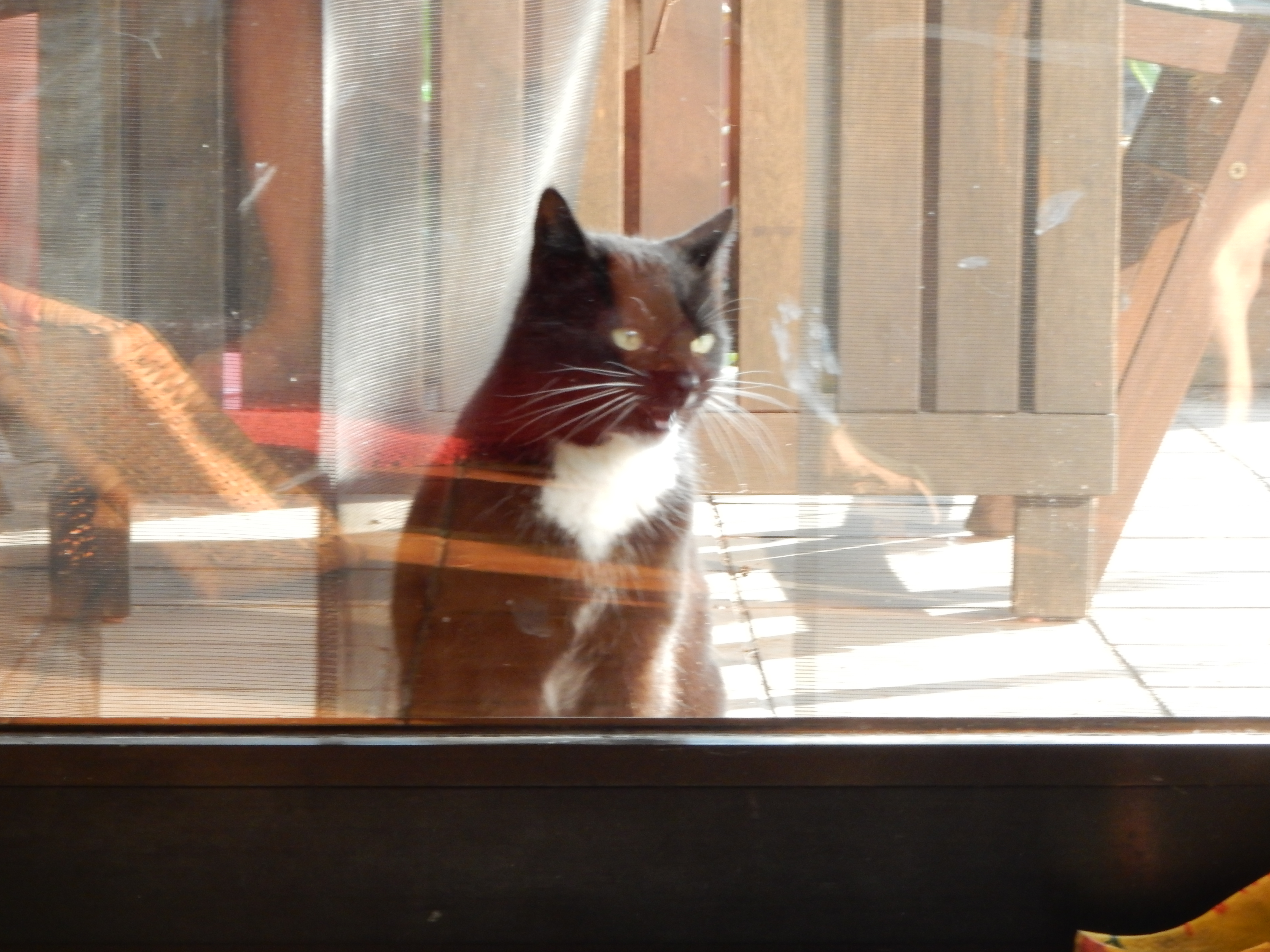 Das selbstbewusste Auftreten von Socke, als hätte er immer schon hier gewohnt, lässt an Reinkarnation glauben. Das ganze Verhalten, wie das Setzen vor das Fliegennetz, Pfote auf die Glasscheibe drücken und das laute Protestieren, kommen mir irgendwie bekannt vor.