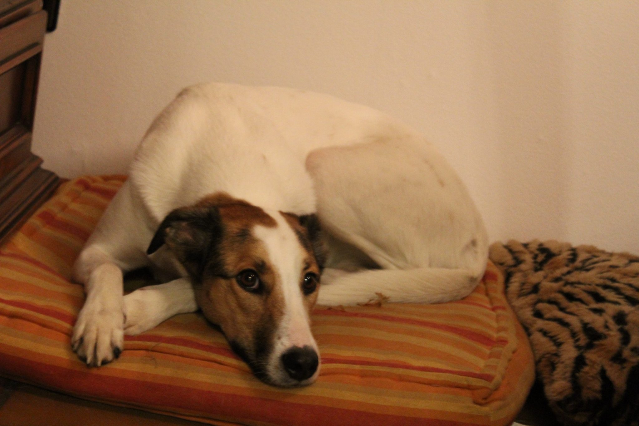 Um Null Uhr saßen wir Menschen plötzlich auf einem Schlag wach im Bett, denn Raketen, Knaller, Polenböller und Raketenbatterien flogen um das Haus. Aus dem Tiefschlaf aufgeschreckt, da konnten wir den Lichtschalter nicht finden. Als es endlich gelang, da sah ich nur noch Zinas weiße Rute unter dem Bett verschwinden und Feli hatte ihren Körper, hechelnder Weise, nicht mehr unter Kontrolle. Es schlotterten ihr die Beine, die Augen sprangen bald aus den Höhlen und das Herzchen schlug mit dem Hecheln um die Wette. Die vorher gut wirkenden Bachblüten richteten gegen den ungeheuren Schwall an Lärm nichts mehr aus.