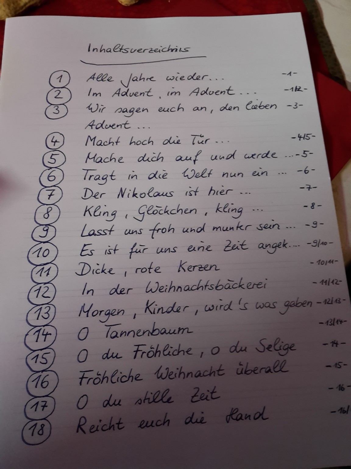 Ein sehr weihnachtlicher Abend fand nach zwei Stunden von Seiten der Frauen ein gibbelndes Ende. Der Abend hatte alles, was man erwarten konnte. Falls ihr auch einmal in eine so nette Sangesrunde geratet, dann wünsche ich euch ein schönes Weihnachtssingen.