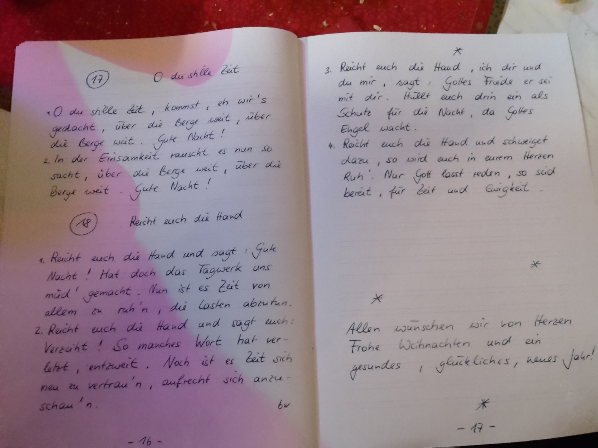 Beim letzten Lied „Reicht euch die Hände“ kam es bei meiner berührten Freundin zu Tränen. Froh war sie, dass sie den letzten Refrain wieder mitsingen konnte. Zu früh gefreut! Das Weihnachtslied wurde mit aneinander gehaltenen Händen noch einmal gesungen, so dass die Sentimentalität auch den letzten Sänger einfangen konnte.