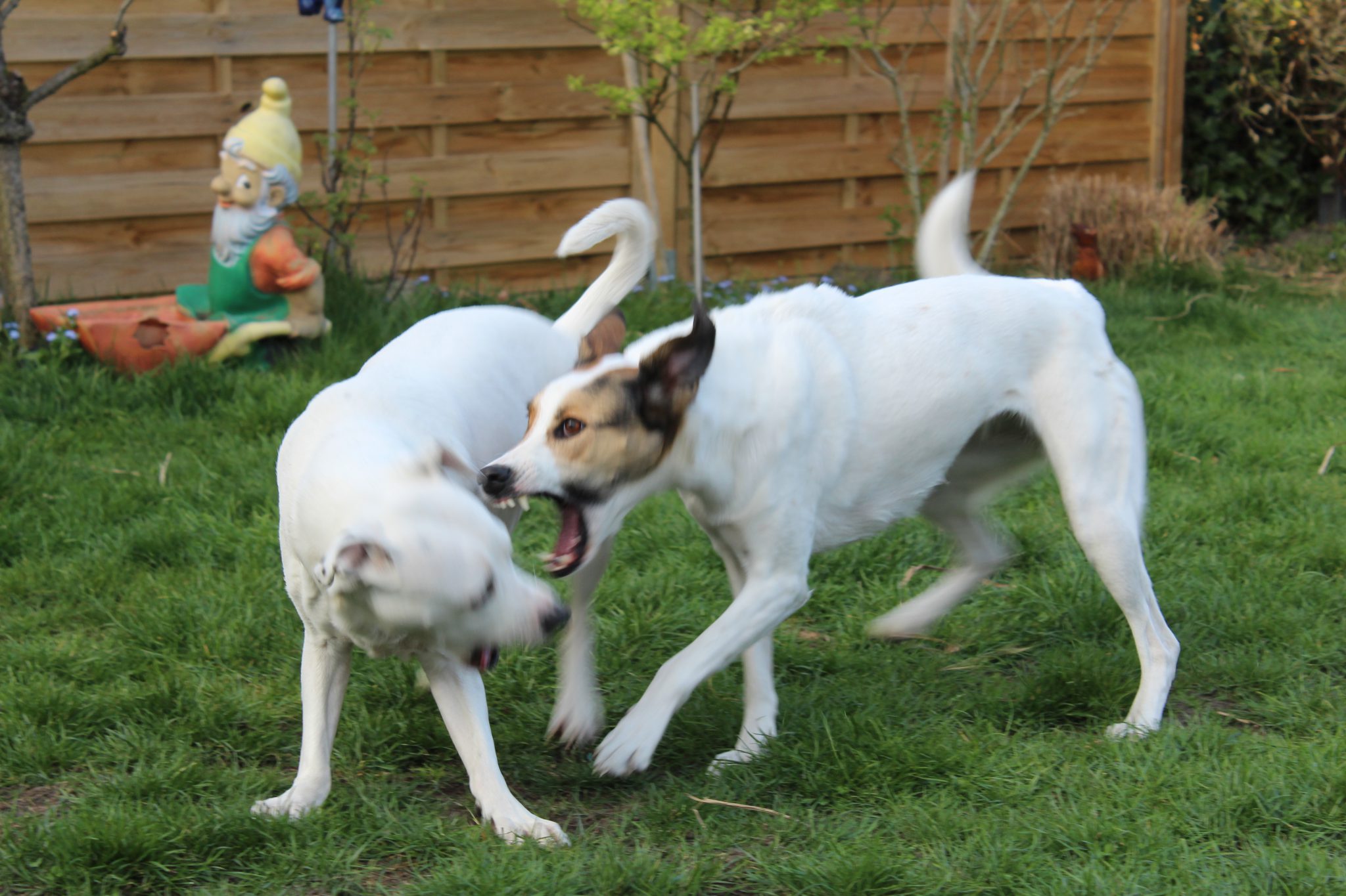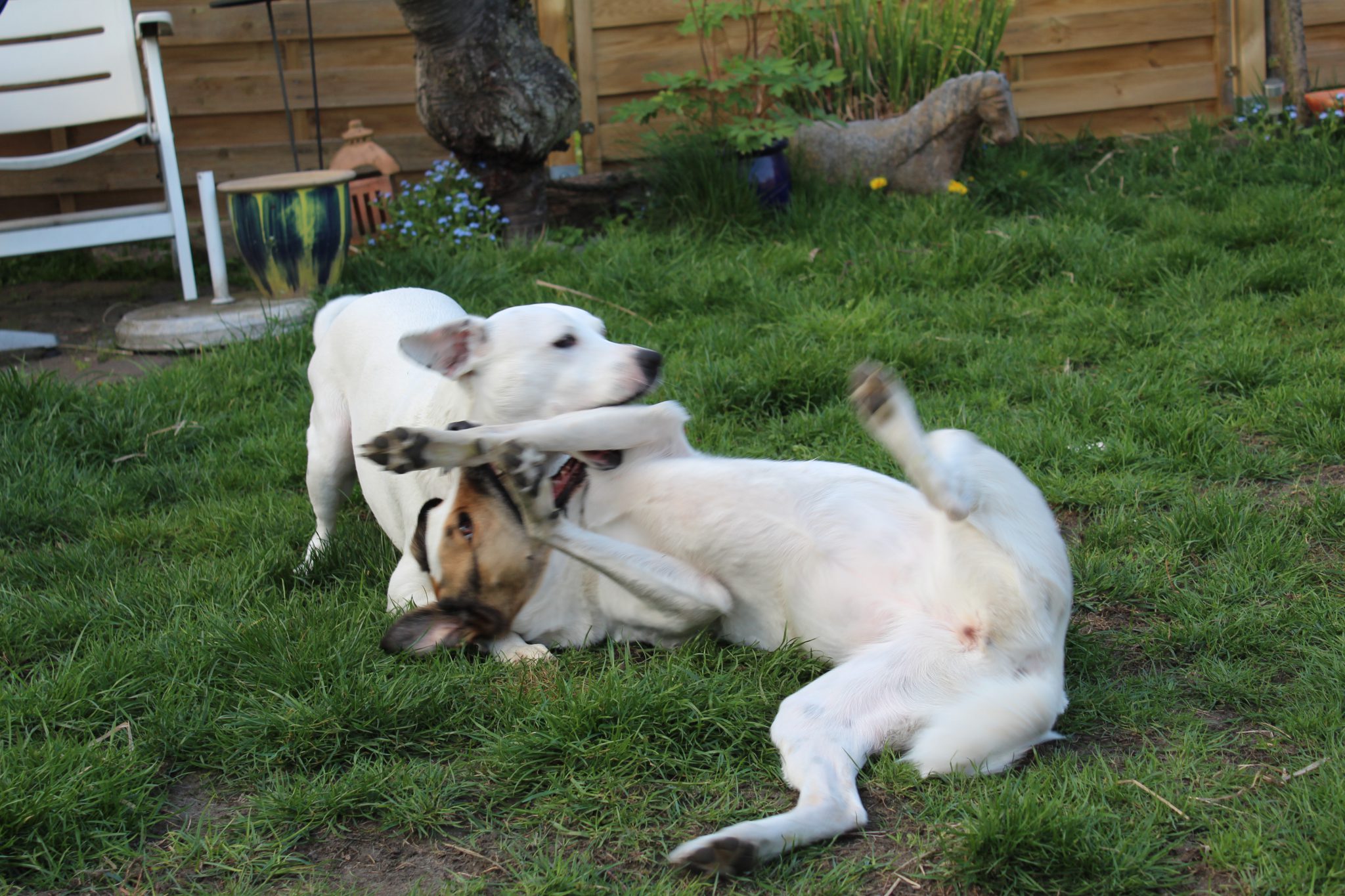 Während wir zum guten Schluss des Gartentages die Gartenutensilien in die Hütte räumen, reißen Feli und Zina den Garten ab. Hundewresteling nennen das meine Hundefreunde aus dem Tierschutzverein Animal Protection Aegina & Agistri, aus dem Zina und Feli stammen. Klingt gefährlich, ist aber einfach nur Geräusch trächtig.
