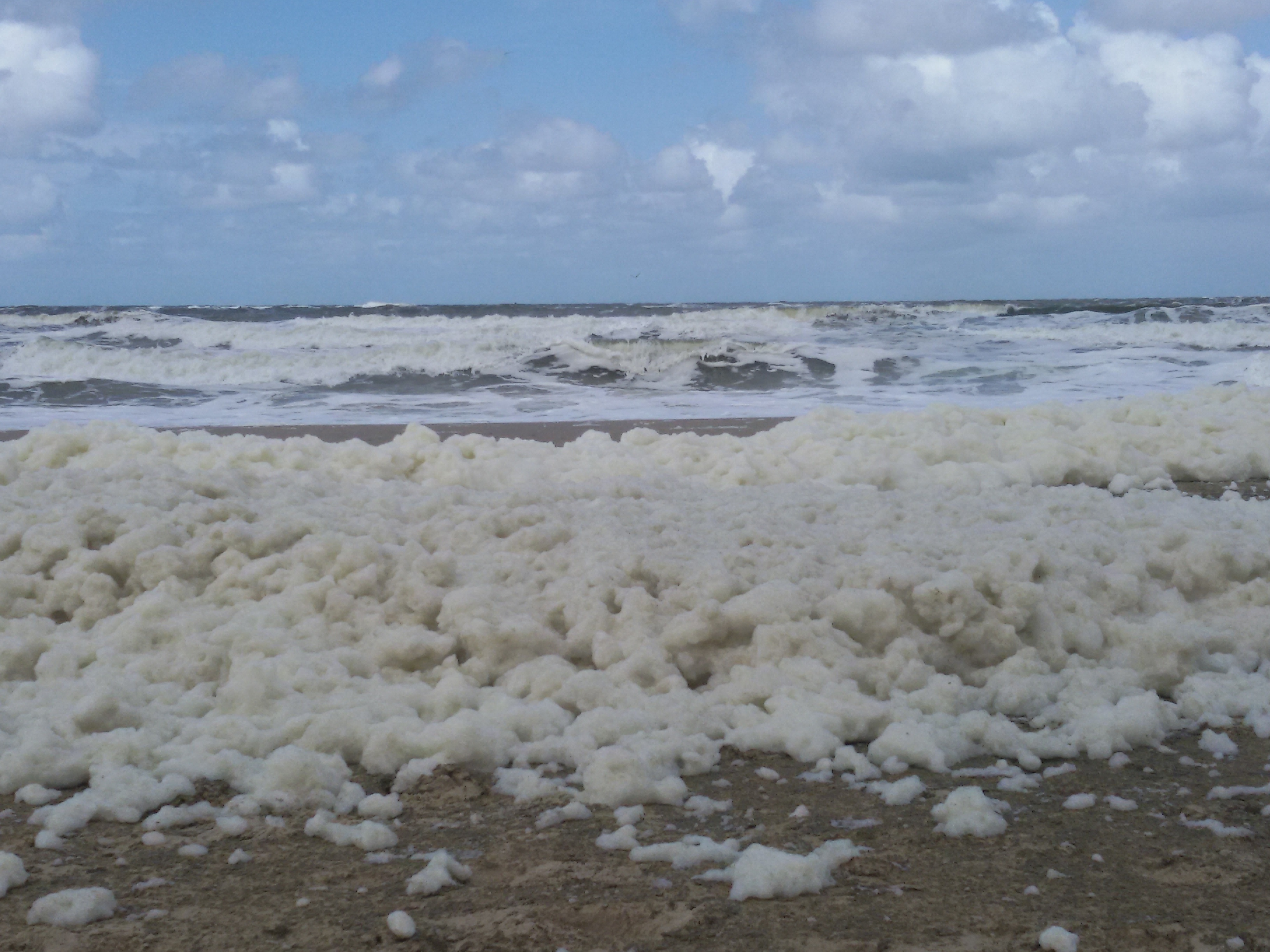 Was uns am Strand erwartete, kam dann völlig unerwartet. Die Wellen türmten sich auf. Die Flut hatte sich weit hoch zum Strand geschoben. Der gesamte Strand war von der Gischt bedeckt. Die Gischt trat in Form von Algenschaum auf, der sich am Strand absetzte. Der Schleim, den die Algen im Meer produzieren, entstand in der Brandung wie Eischnee. Ein Gischtteppich bedeckte den Strand.